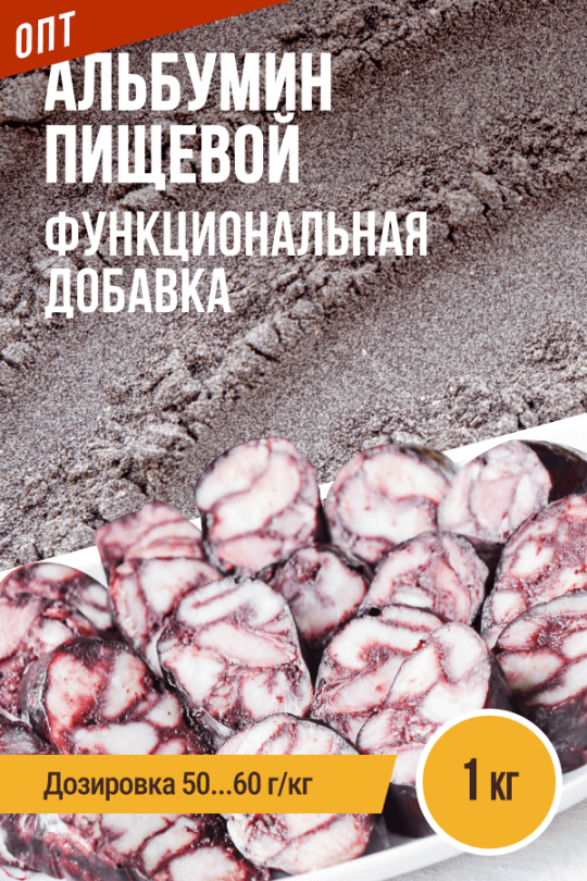 Именно поэтому, в нашем продукте «Альбумин» большая часть практически безвкусной плазмы, создающей термостабильную прочную белковую матрицу, форму для кровяной колбасы и небольшая часть сушеного гемоглобина для создания цвета и аромата в рецепте классической кровяной колбасы.