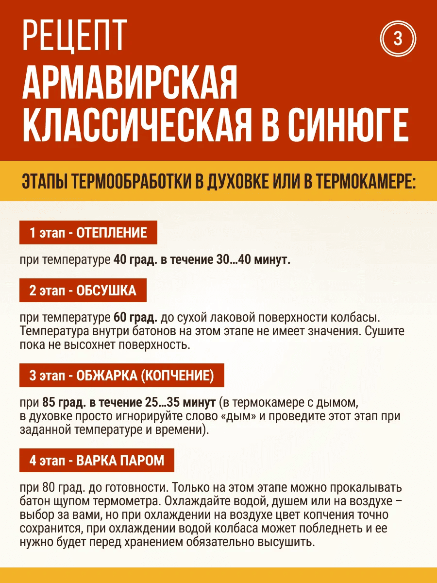 - Обжарка (копчение) – при 85 град. в течение 25…35 минут (в термокамере с дымом, в духовке просто игнорируйте слово «дым» и проведите этот этап при заданной температуре и времени).