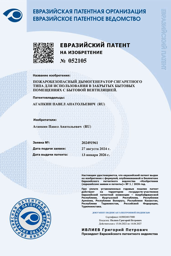 Дымогенератор сигаретного типа, который можно безопасно использовать прямо в квартире, официально запатентован! Евразийское патентное ведомство выдало патент на пожаробезопасное устройство сигаретного типа, созданное именно для бытовых условий.