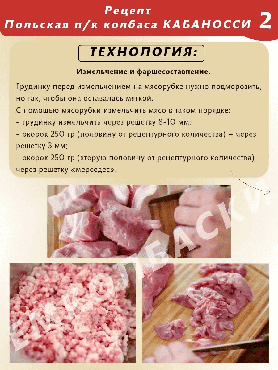 Смешать все сухие ингредиенты с измельченным нежирным сырьем (окорок). Активно вымешивать фарш до приобретения клейкого состояния фаршем (фарш должен плохо отлипать от рук).