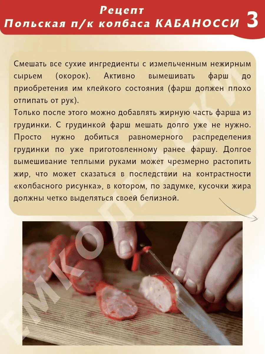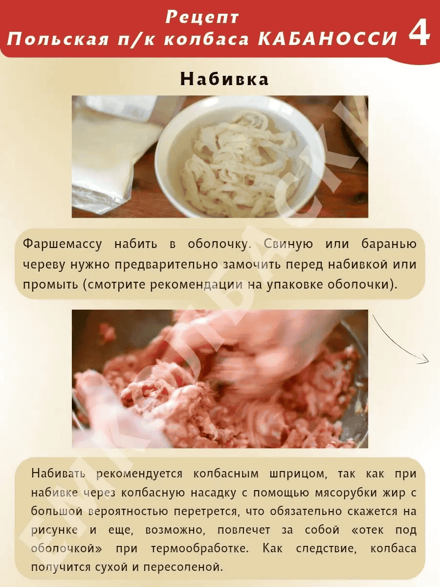 Свиную или баранью череву нужно предварительно замочить перед набивкой или промыть (смотрите рекомендации на упаковке оболочки). Набивать рекомендуется колбасным шприцом, так как при набивке через колбасную насадку с помощью мясорубки жир с большой вероятностью перетрется, что обязательно скажется на рисунке и еще, возможно, повлечет за собой «отек под оболочкой» при термообработке. Как следствие, колбаса получится сухой и пересоленой.