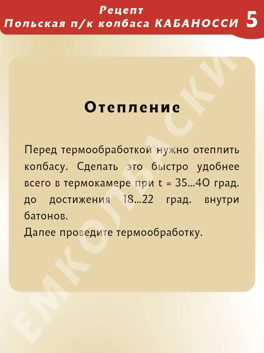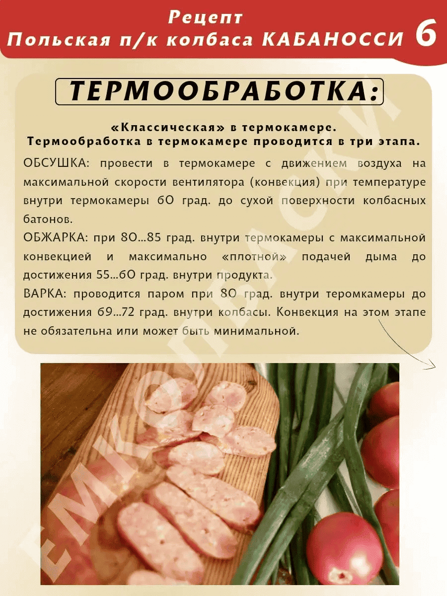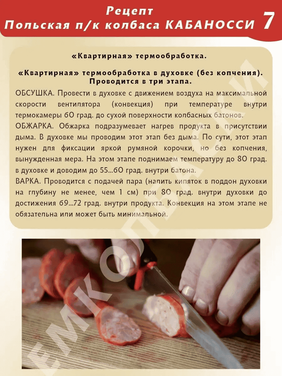 ОБСУШКА: провести в духовке с движением воздуха на максимальной скорости вентилятора (конвекция) при температуре внутри духовки 60 град. до достижения 37…42 град. внутри продукта. Далее с максимальной конвекцией довести температуру внутри духовки до 80…85 град. до достижения 55…60 град. внутри колбасы.