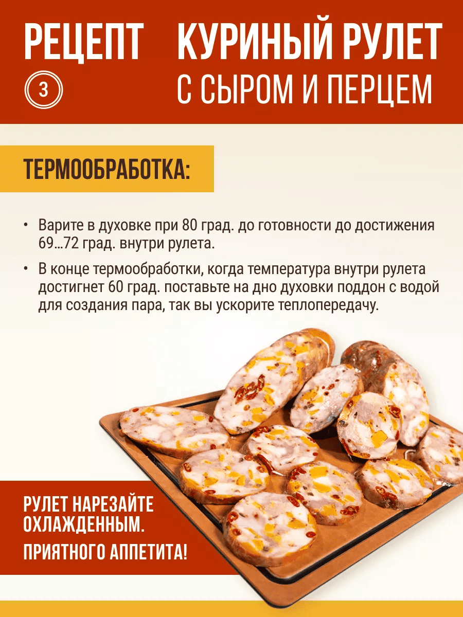 - Термообработку проводите в духовке при 80 град. до готовности до достижения 69…72 град. внутри рулета.