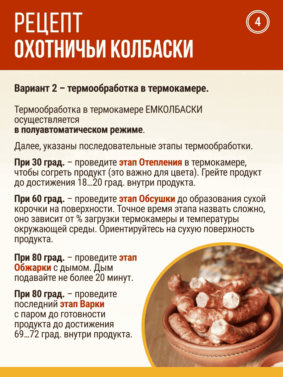 Осуществляйте этап Варка до готовности колбасок, до достижения 69…72 град. внутри.