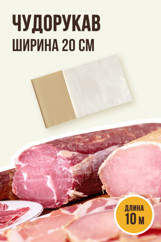 Чудорукав позволит вам использовать столько длины, сколько необходимо для вашего куска мяса. Вы можете приобрести 1, 2 или 5 метров чудорукава и отрезать по необходимости нужную длину.