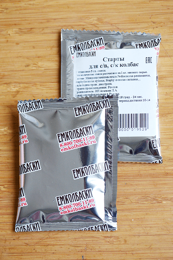 Стартовые культуры "Старты для колбас сыровяленых V2" расфасованы удобно в фольгированные пакетики-саше.