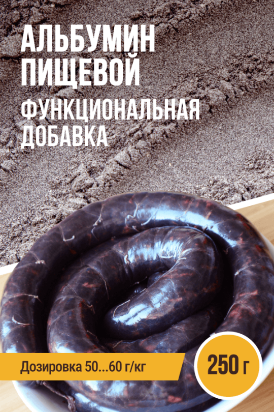 Именно поэтому, в нашем продукте «Альбумин» большая часть практически безвкусной плазмы, создающей термостабильную прочную белковую матрицу, форму для кровяной колбасы и небольшая часть сушеного гемоглобина для создания цвета и аромата в рецепте классической кровяной колбасы.