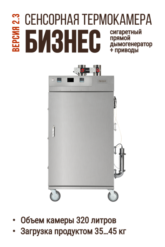 Термокамера ЕМКОЛБАСКИ Бизнес с приводами полуавтомат с ЖК-экраном, Сигаретный прямой дымогенератор, рабочий объем 320 л, версия 2.3