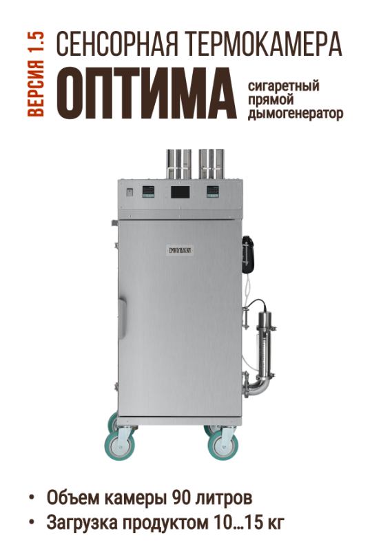 Термокамера ЕМКОЛБАСКИ Оптима без приводов полуавтомат с ЖК-экраном, Сигаретный прямой дымогенератор, рабочий объем 90 л, версия 1.5