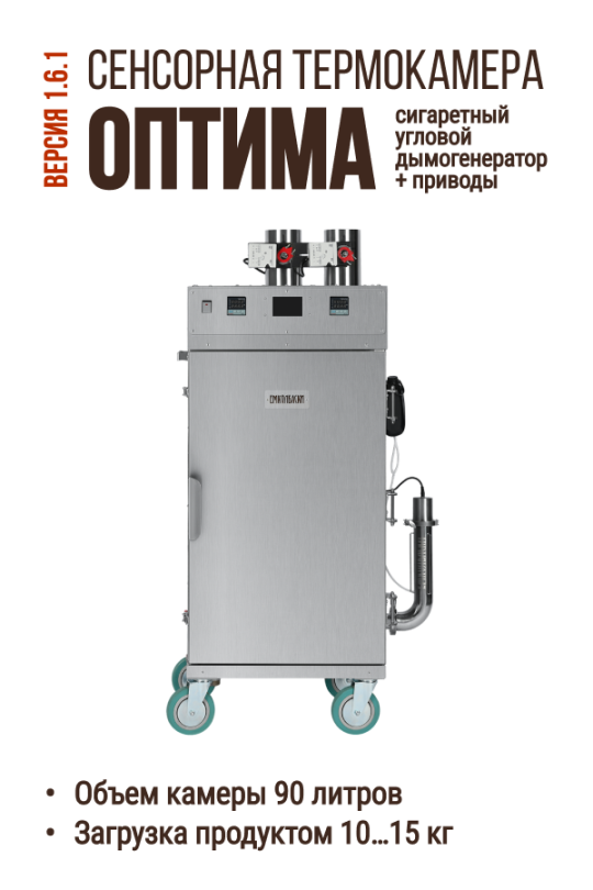 Термокамера ЕМКОЛБАСКИ Оптима с приводами полуавтомат с ЖК-экраном, Сигаретный угловой дымогенератор, рабочий объем 90 л, версия 1.6.1